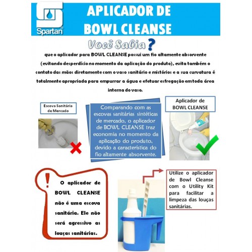 – Com o aplicador, remover a água do vaso sanitário, empurrando-a pela saída do vaso. Pressionar o aplicador contra a parede lateral do vaso para retirar o excesso de água. Encharcar o aplicador com BOWL CLEANSE puro. Esfregar toda a superfície do vaso ou mictório com aplicador, principalmente sob a borda, onde se encontram as saídas de água. Para ação desinfetante o tempo de contato é de 10 minutos. Acionar a descarga várias vezes e enxaguar cuidadosamente o aplicador. Restrito ao uso profissional. Para abrir a embalagem force o lacre girando a tampa.