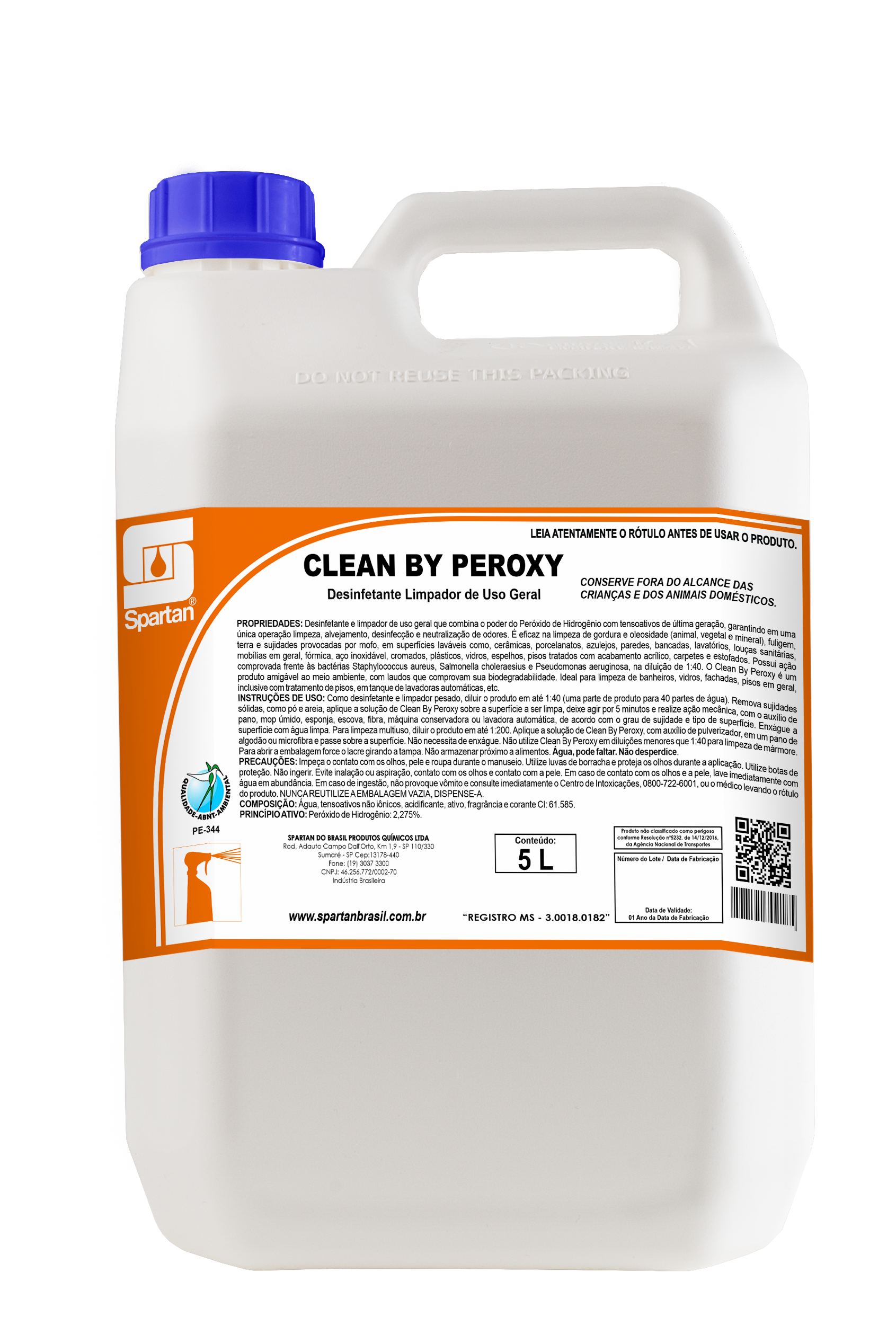 CLEAN BY PEROXY é um desinfetante limpador de uso geral indicado para superfícies. Concentrado, a base de peróxido de hidrogênio com tensoativos de última geração. Livre de Fosfato, EDTA, Nonilfenol, Amônia e Solventes, contém tensoativos biodegradáveis. CLEAN BY PEROXY combina o poder do Peróxido de Hidrogênio e tensoativos de última geração oferecendo excelente performance de limpeza e desinfecção. Possui ação comprovada frente às bactérias Staphylococcus aureus, Salmonella choleraesius na diluição de até 1:40 com tempo de ação de 5 minutos. A combinação de peróxido de hidrogênio com o mais recente surfactante é uma eficaz solução para limpeza geral, seu poder oxidante oferece ação como alvejante das superfícies e controle de odores. CLEAN BY PEROXY atua em gorduras e oleosidades (animal, vegetal e mineral), fuligens, terra e sujidades provocadas por mofo, facilitando a sua remoção em superfícies fixas laváveis tipo: cerâmicas, porcelanatos, azulejos, paredes, bancadas, lavatórios, louças sanitárias, mobílias em geral, fórmica, aço inoxidável, cromados, plásticos, vidros, espelhos, pisos tratados com acabamento acrílico, carpetes e estofados. Ideal para utilização em supermercados, lojas comerciais, clínicas em geral, escritórios, shoppings, dentre outros estabelecimentos. CLEAN BY PEROXY é versátil e econômico, pois substitui limpadores alcalinos, desinfetantes neutros e clorados, remove sujeira leve e pesada da superfície, reduzindo a necessidade de ação mecânica agr
