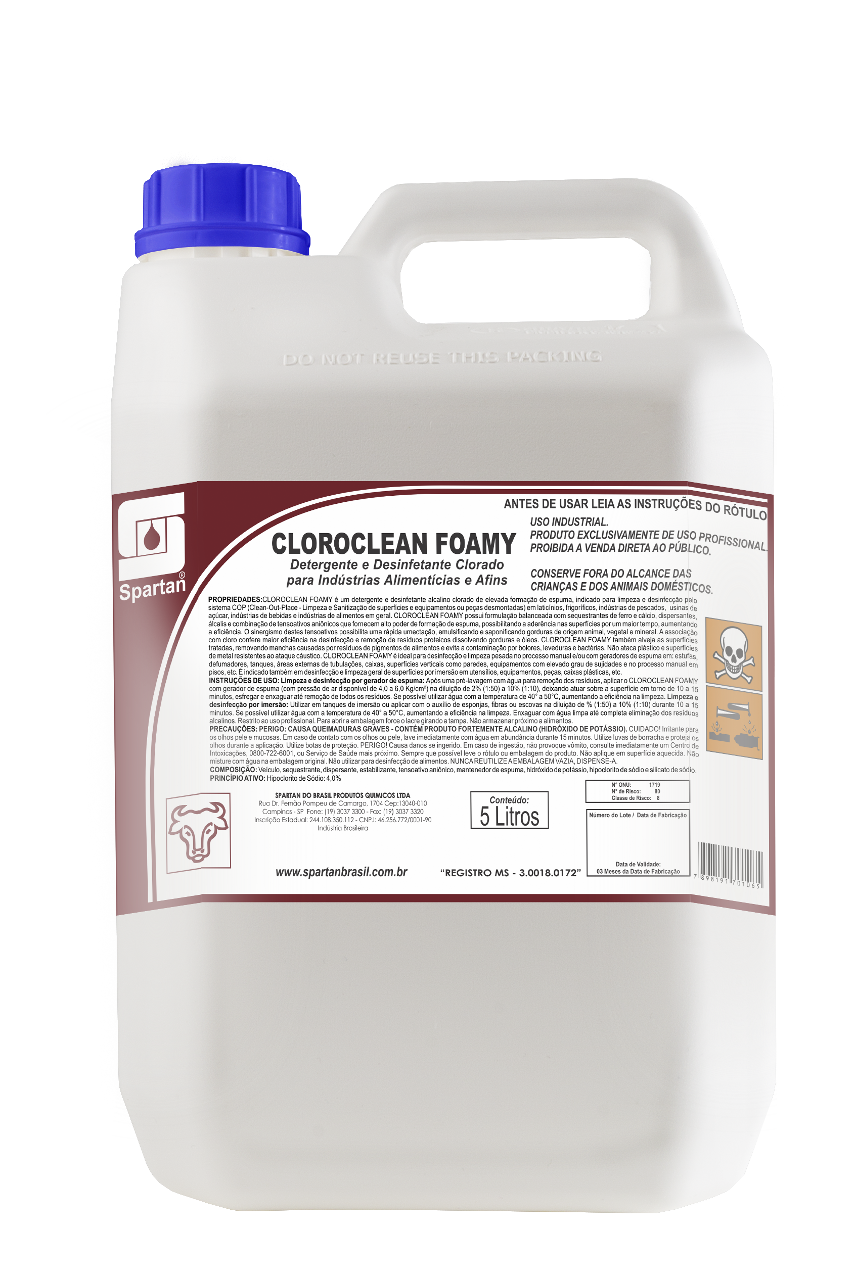 CLOROCLEAN FOAMY é um detergente e desinfetante alcalino clorado de elevada formação de espuma, indicado para limpeza e desinfecção pelo sistema COP (Clean-Out-Place – Limpeza e Sanitização de superfícies e equipamentos ou peças desmontadas) em laticínios, frigoríficos, indústrias de pescados, usinas de açúcar, indústrias de bebidas e indústrias de alimentos em geral. CLOROCLEAN FOAMY possui formulação balanceada com sequestrantes de ferro e cálcio, dispersantes, álcalis e combinação de tensoativos aniônicos que fornecem alto poder de formação de espuma, possibilitando a aderência nas superfícies por um maior tempo, aumentando a eficiência. O sinergismo destes tensoativos possibilita uma rápida umectação, emulsificando e saponificando gorduras de origem animal, vegetal e mineral. A associação com cloro confere maior eficiência na desinfecção e remoção de resíduos proteicos dissolvendo gorduras e óleos. CLOROCLEAN FOAMY DESINFETANTE ALCALINO também alveja as superfícies tratadas, removendo manchas causadas por resíduos de pigmentos de alimentos e evita a contaminação por bolores, leveduras e bactérias. Não ataca plástico e superfícies de metal resistentes ao ataque cáustico. CLOROCLEAN FOAMY DESINFETANTE ALCALINO é ideal para desinfecção e limpeza pesada no processo manual e/ou com geradores de espuma em: estufas, defumadores, tanques, áreas externas de tubulações, caixas, superfícies verticais como paredes, equipamentos com elevado grau de sujidades e no processo manual em pisos, etc. É indicado também em desinfecçãoInstruções de uso: