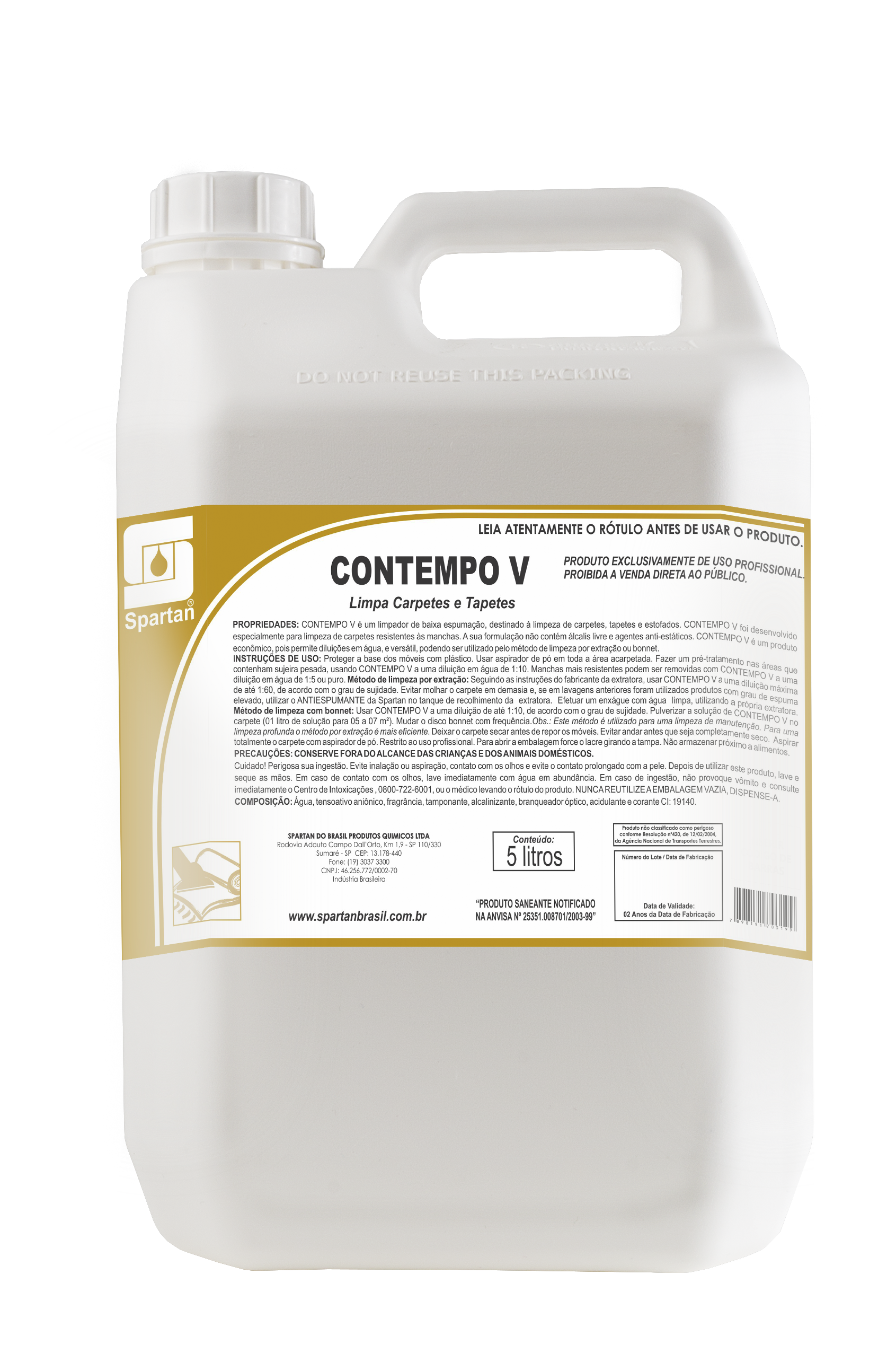 CONTEMPO V é um limpador neutro concentrado de baixa espumação, destinado à limpeza de carpetes, tapetes e estofados.