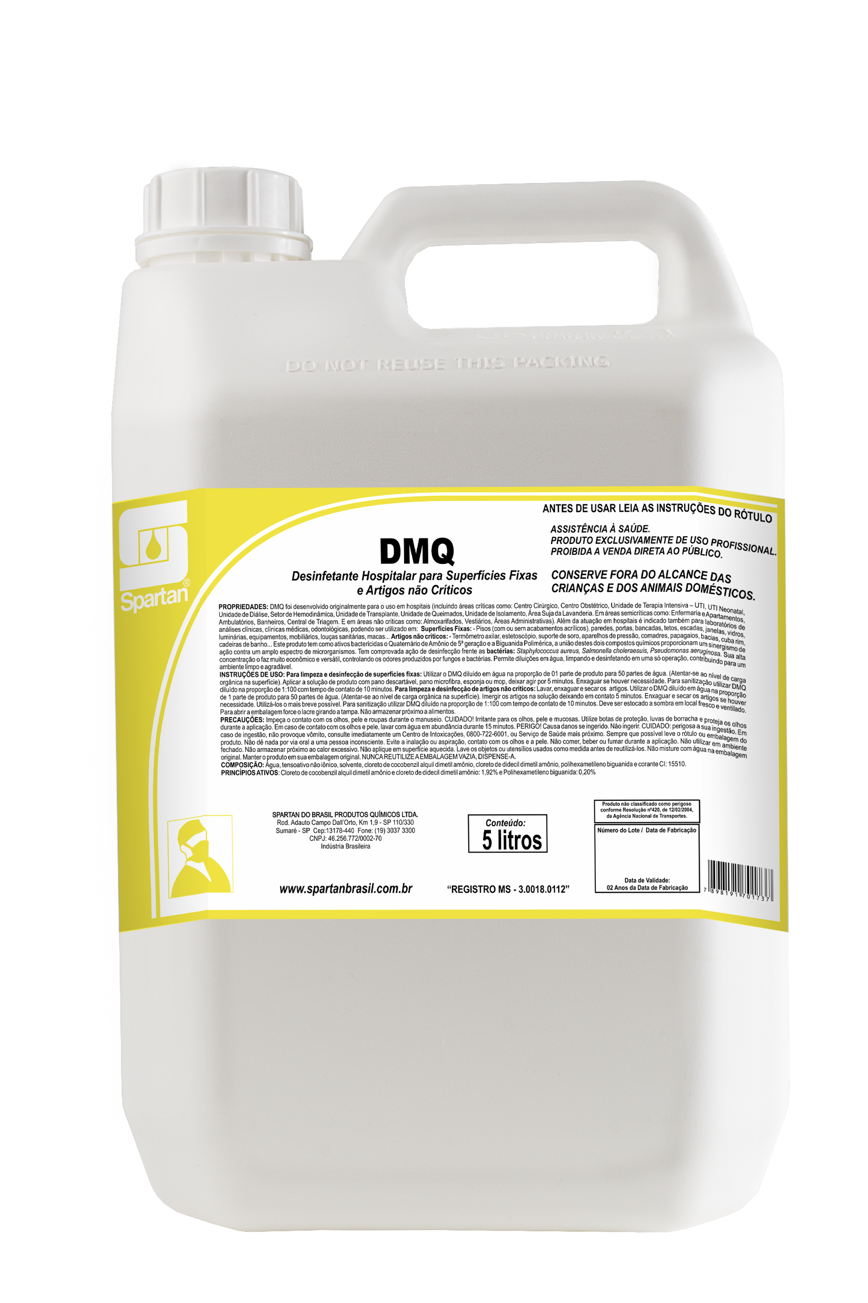DMQ é um desinfetante a base de Quaternário de Amônio de 5ª geração e Biguanida Polimérica que foi desenvolvido originalmente para o uso em hospitais (incluindo áreas críticas como: Centro Cirúrgico, Centro Obstétrico, UTI, UTI Neonatal, Unidade de Diálise, Setor de Hemodinâmica, Unidade de Transplante, Unidade de Queimados, Unidade de Isolamento, Área Suja da Lavanderia. Em áreas semicríticas como: Enfermaria e Apartamentos, Ambulatórios, Banheiros, Central de Triagem. E em áreas não críticas como: Almoxarifados, Vestiários, Áreas Administrativas). Além da atuação em hospitais é indicado também para laboratórios de análises clínicas, clínicas médicas, odontológicas, de estética e veterinária, podendo ser utilizado em: – Superfícies Fixas: Pisos, paredes, portas, bancadas, tetos, escadas, janelas, vidros, luminárias, equipamentos, mobiliários, louças sanitárias, macas, – Artigos não críticos: Termômetro axilar, estetoscópio, suporte de soro, aparelhos de pressão, comadres, papagaios, bacias, cuba rim, cadeiras de banho. Tem ação bactericida e bacteriostática agindo com eficácia sobre as bactérias gram positivas e gram negativas, sendo comprovada sua ação de desinfecção frente as bactérias: Staphylococcus aureus, Salmonella choleraesuis, Pseudomonas aeruginosa, Enterococcus hirae, Escherichia coli, aos fungos: Aspergillus niger e Candida albicans, e as bactérias multirresistentes: Acinetobacter baumannii, Klebsiella Pneumoniae Carbapenemase (KPC) e Staphylococcus MRSA.Instruções de uso: