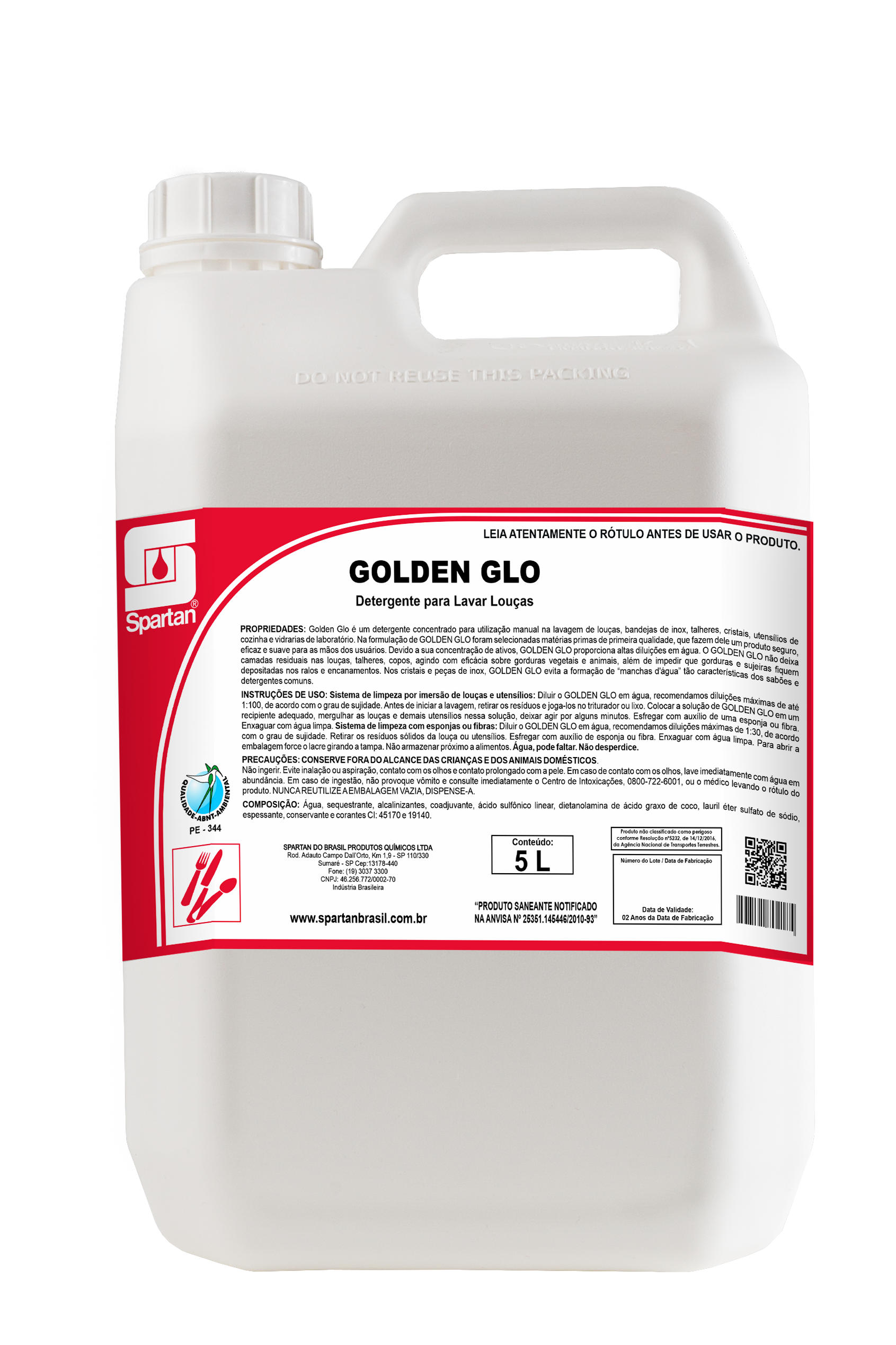 GOLDEN GLO é um detergente neutro concentrado para utilização manual na lavagem de louças, bandejas de inox, talheres, cristais, utensílios de cozinha e frascos delicados de laboratório. Na formulação de GOLDEN GLO foram selecionadas matérias primas de primeira qualidade, que fazem dele um produto seguro, eficaz e suave para as mãos dos usuários. Devido a sua concentração de ativos, GOLDEN GLO proporciona altas diluições em água.