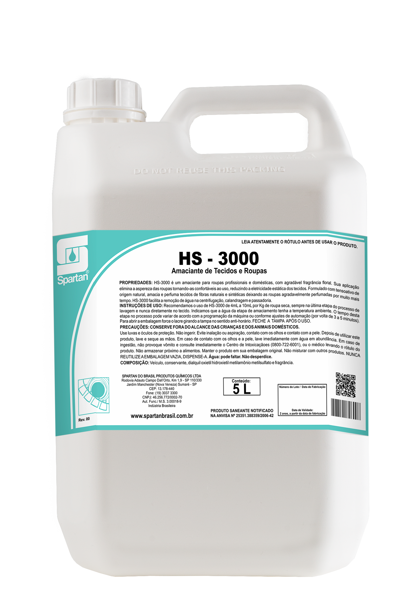 HS – 3000 é um amaciante de tecidos, com a propriedade de restaurar as fibras dos tecidos tornando-as macias e perfumadas. HS – 3000 atua no sistema eletrostático dos tecidos, desembaraça as fibras, deixando as roupas mais agradáveis ao toque. Ideal para lavanderias hospitalares, comerciais, hoteleiras e industriais.