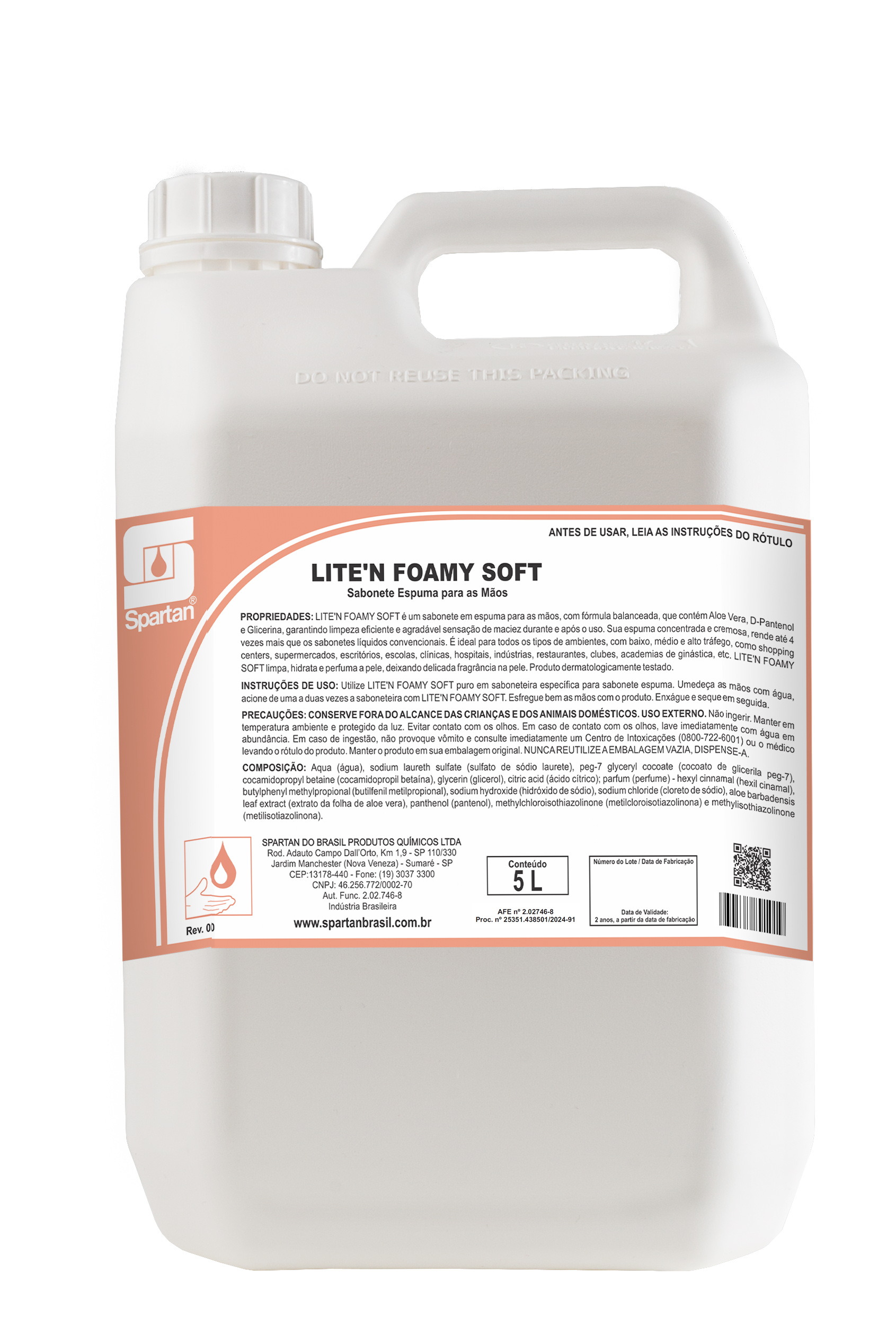 LITE’N FOAMY SOFT é um sabonete em espuma para as mãos, com fórmula balanceada, que contém Aloe Vera, D-Pantenol e Glicerina,