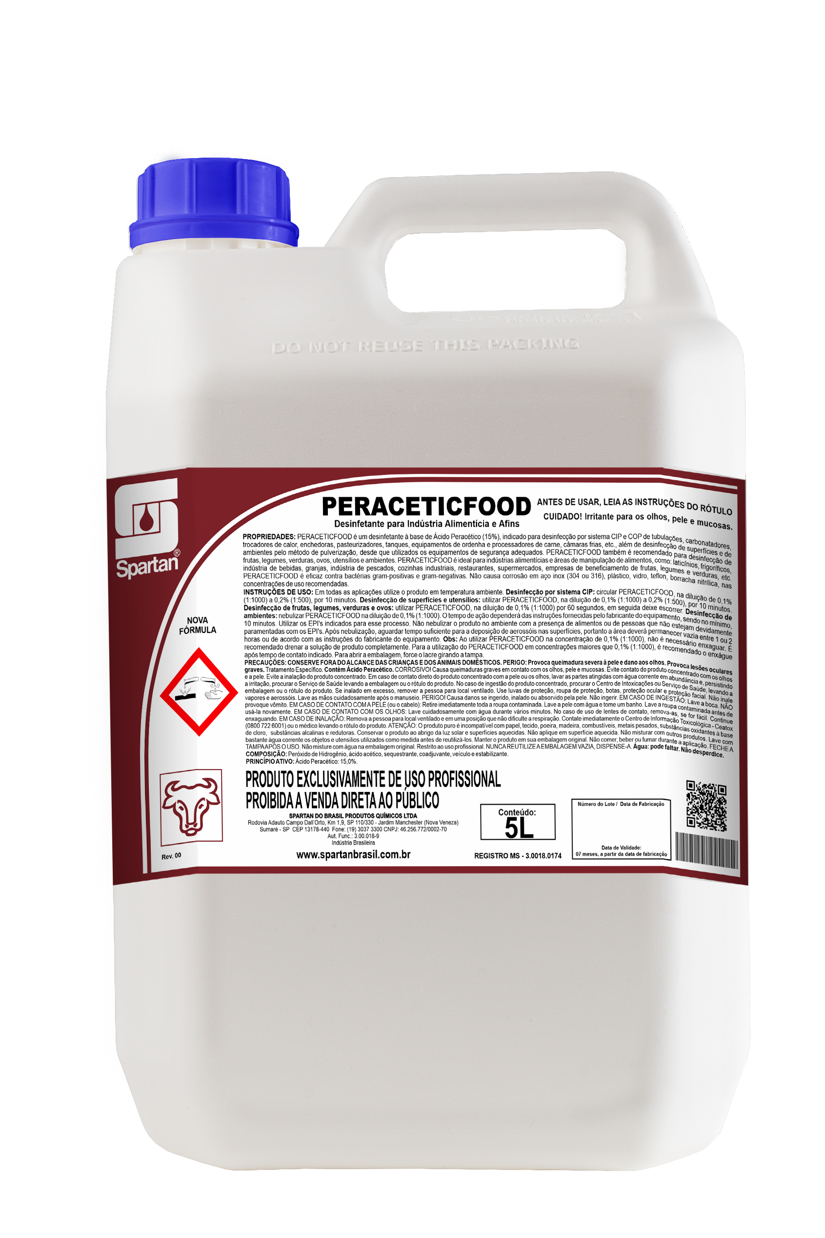 PERACETICFOOD é um desinfetante a base de Ácido Peracético (15%) destinado a um grande número de aplicações envolvendo desinfecções em indústrias alimentícias e de bebidas. Em Indústrias de Bebidas pode ser utilizado na limpeza CIP (Clean-In-Place – limpeza e sanitização de equipamentos em circuito fechado) para desinfecção de tanques, tubulações, carbonatadores, trocadores de calor e enchedores. Em Laticínios podem ser utilizados para desinfecção de tubulações, pasteurizadores, envasadoras e tanques. É destinado para a desinfecção em aplicações gerais em Indústrias Alimentícias, incluindo equipamentos processadores de carne e câmaras frias. Desde que utilizados os equipamentos de segurança adequados também pode ser utilizado para a desinfecção de superfícies e de ambientes pelo método de pulverização. PERACETICFOOD é eficaz contra bactérias gram-positivas e gram-negativas. Não causa corrosão em aço inox, alumínio, plástico, vidro, teflon, borracha nitrílica, nas concentrações de uso recomendadas.Instruções de uso: