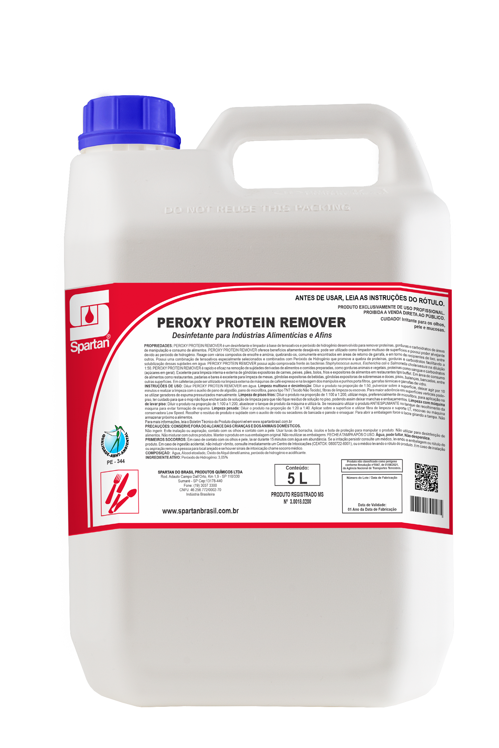 PEROXY PROTEIN REMOVER é um Desinfetante e limpador à base de tensoativos e peróxido de hidrogênio desenvolvido para remover proteínas, gorduras e carboidratos de áreas de manipulação e consumo de alimentos. PEROXY PROTEIN REMOVER oferece benefícios altamente desejáveis: pode ser utilizado como limpador multiuso de superfícies que não requer enxágue e possui poder alvejante devido ao peróxido de hidrogênio. Reage com vários compostos de enxofre e amônia, quebrando-os e neutralizando odores desagradáveis, comumente encontrados em áreas de retorno de garrafa, e em torno de recipientes de lixo, entre outros. Possui uma combinação de tensoativos especialmente selecionados e combinados com Peróxido de Hidrogênio que promove a quebra de proteínas, gorduras e carboidratos, facilitando a solubilização dessas sujidades em água. PEROXY PROTEIN REMOVER é rápido e eficaz na remoção de sujidades derivadas de alimentos e comidas preparadas, como gorduras animais e vegetais, proteínas como sangue e carboidratos (açúcares em geral). Excelente para limpeza interna e externa de gôndolas expositoras de carnes, peixes, pães, bolos, frios e expositores de alimentos em restaurantes tipo buffet. Em área de consumo de alimentos como restaurantes, padarias e bares é excelente para limpeza de mesas, gôndolas expositoras de bebidas, gôndolas expositoras de sobremesas e doces, pisos, balanças, bancadas, entre outras superfícies. Em cafeterias pode ser utilizado na limpeza externa de máquinas de café expresso e na lavagem dos manípulos e punhos porta filtros, garrafas térmicas e garrafas de vidro.Instruções de uso: