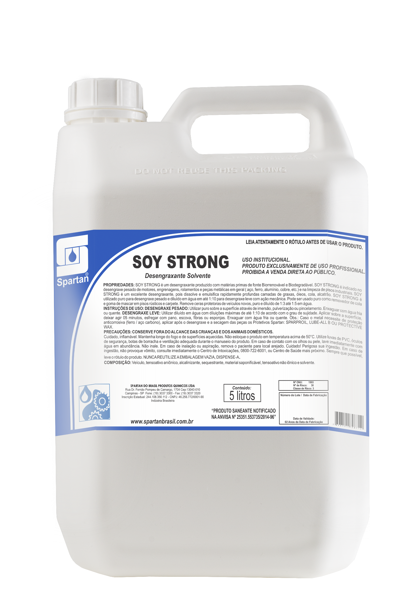 SOY STRONG é um desengraxante produzido com matérias primas de fonte Biorrenovável e Biodegradável. SOY STRONG é indicado no desengraxe pesado de motores, engrenagens, rolamentos e peças metálicas em geral ( aço, ferro, alumínio, cobre, etc.) e na limpeza de pisos industriais. SOY STRONG é um excelente desengraxante, pois dissolve e emulsifica rapidamente profundas camadas de graxas, óleos, cola, alcatrão. SOY STRONG é utilizado puro para desengraxe pesado e diluído em água em até 1:10 para desengraxe leve com ação mecânica. Pode ser usado puro como removedor de cola e goma de mascar em pisos rústicos e carpete. Remove ceras protetoras de veículos novos, puro e diluído de 1:3 até 1:5 em água.Instruções de uso: