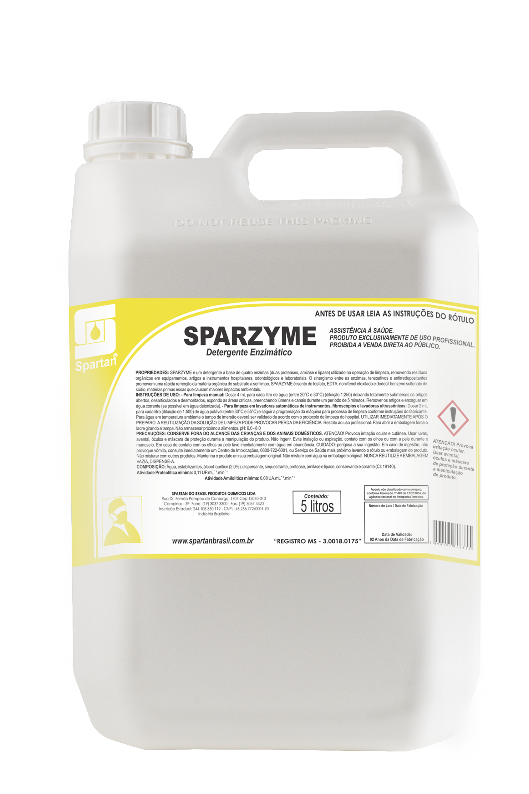SPARZYME é um detergente a base de quatro enzimas (duas proteases, amilase e lipase) utilizado na operação de limpeza, removendo resíduos orgânicos em equipamentos, artigos e instrumentos hospitalares, odontológicos e laboratoriais. O sinergismo entre as enzimas, tensoativos e antirredepositantes promovem uma rápida remoção da matéria orgânica do substrato a ser limpo. SPARZYME é isento de fosfato, EDTA, nonilfenol etoxilado e dodecil benzeno sulfonato de sódio, matérias primas essas que causam maiores impactos ambientais.