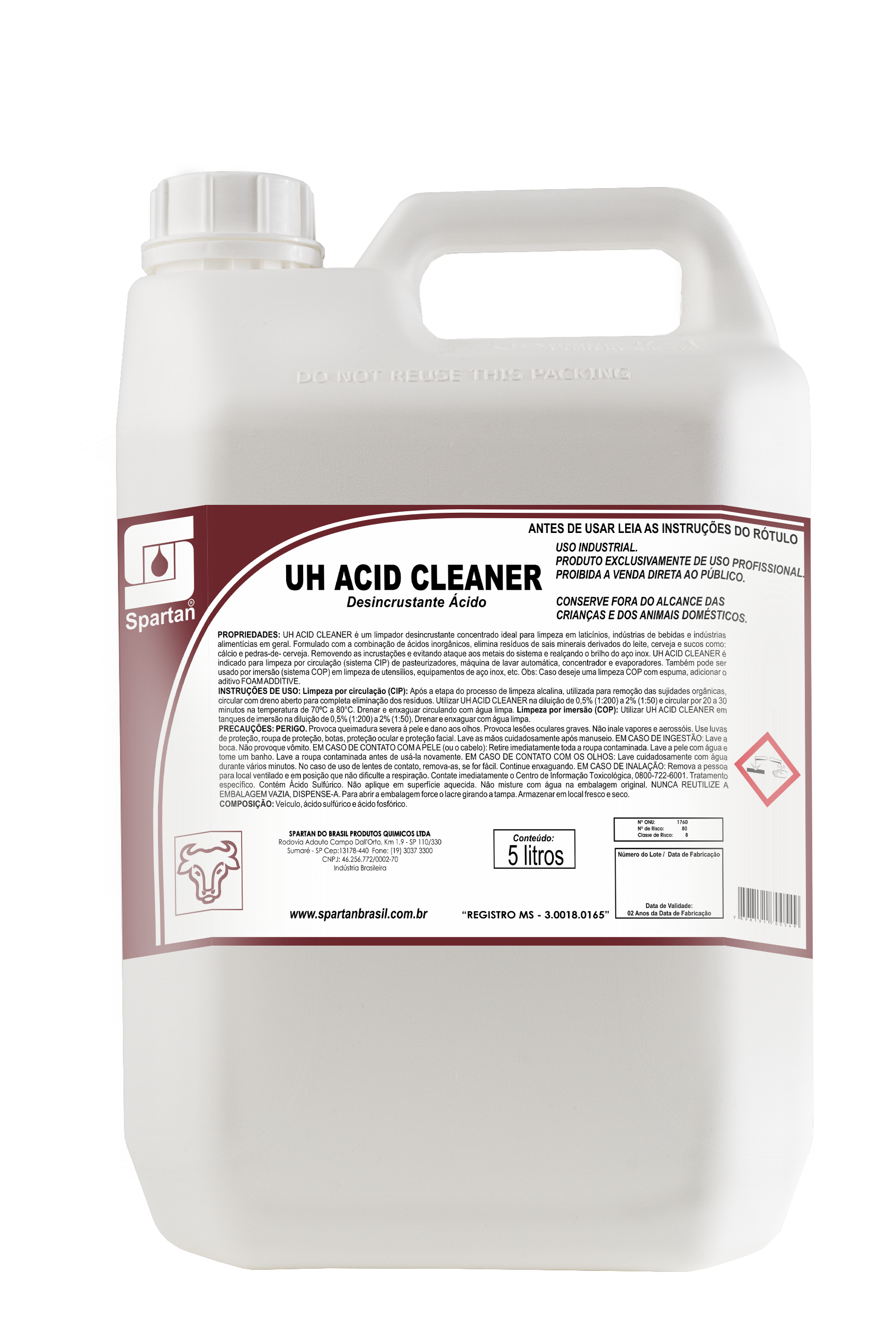 UH ACID CLEANER é um limpador desincrustante super concentrado ideal para limpeza em laticínios, indústrias de bebidas e indústrias alimentícias em geral. Formulado com a combinação de ácidos inorgânicos e inibidores de corrosão, elimina resíduos de sais minerais derivados do leite, cerveja e sucos como: cálcio e pedras-de-cerveja. Removendo as incrustações e evitando ataque aos metais do sistema e realçando o brilho do aço inox. UH ACID CLEANER é indicado para limpeza por circulação (Sistema CIP) de pasteurizadores, maquina de lavar automática, concentrador, evaporadores. Também pode ser usado por imersão (Sistema COP) em limpeza de utensílios, equipamentos de aço inox, etc. Obs.: Caso deseje uma limpeza COP com espuma, adicionar o aditivo FOAM ADDITIVE.Instruções de uso: